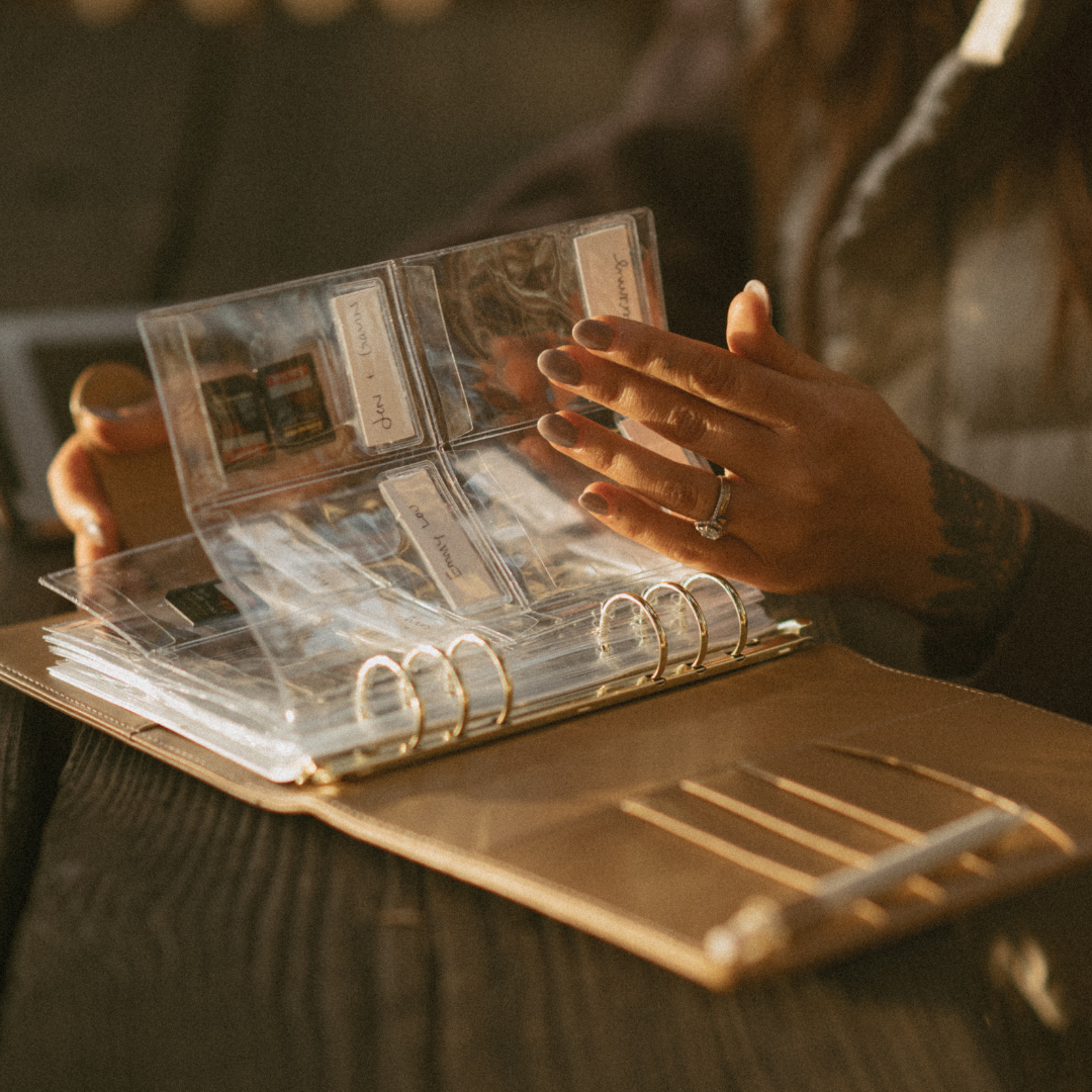 On each of the pockets (4 per page), there is a flap at the top that keeps your cards safe inside. They cannot fall out the top, so in case you drop your organizer, or it falls out of your bag, the cards will stay safe and organized.